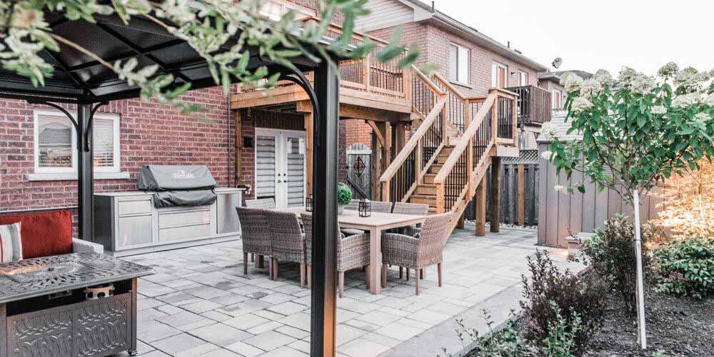 We added a transitional walkway from front to back to a walkout basement, which leads into a backyard that boasts a large bbq area, raised garden beds, cabana, dining area and steps leading to an upper level deck to access the main floor of the home.
