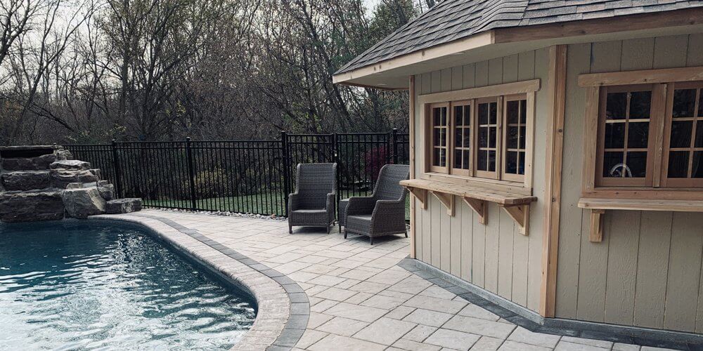 The pool side cabana acts as a bar and change area and hides the pool equipment, while maximizing space because of its five-sided shape.